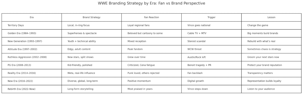 Here’s a breakdown of WWE’s major eras—and the branding lessons behind each: